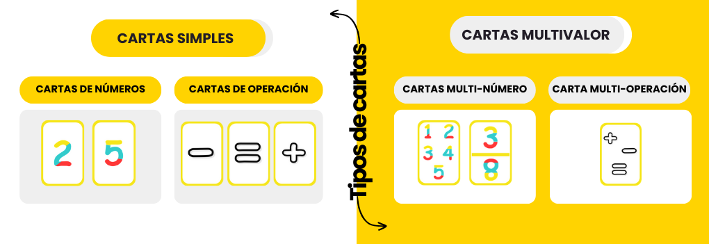 Las cartas de EQUALIS se dividen principalmente en dos grupos, cartas simples (contienen un valor numérico o un signo de operación) y cartas multi-valor (tienen varios valores posibles).