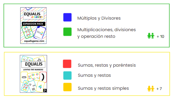 Equalis es un juego de cartas que tiene dos paquetes y que te da la opción de jugar con dos niveles de dificultad. Si juegas con la baraja de Equalis realizarás sumas y restas y si añades la baraja de Equalis Avanzado tendrás que realizar también multiplicaciones y divisiones.