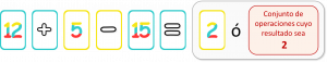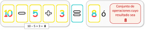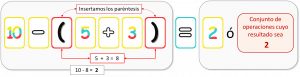 Pero en las cartas que tenemos no tenemos un 8, ni podemos construir un conjunto de operaciones que den 8, pero sí un 2. Si cogemos las cartas auxiliares “Paréntesis” y las insertamos como se muestra en la siguiente figura el resultado será entonces 2